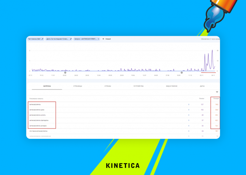 Пример ранжирования запросов кластера «антикоагулянты» в поисковой строке Google.