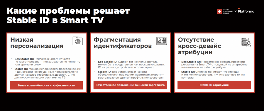 Platforma решила три критические задачи Smart TV рекламы: низкую персонализацию, фрагментацию идентификаторов и отсутствие кросс-девайс атрибуции. Технология позволила использовать поведенческие данные из других каналов для персонализации рекламы на Smart-TV, объединить все устройства пользователя под единым идентификатором и связать просмотр рекламы на Smart TV с рекламой в digital.