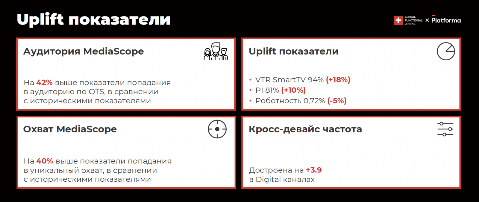 - На 40% выше показатели попадания в уникальный охват, в сравнении с историческими показателями.