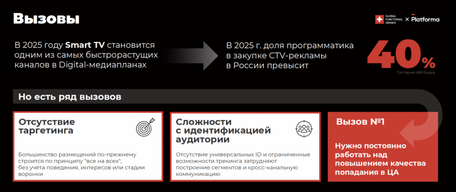 Параллельно растет и программатический сегмент: доля программатика в закупке CTV-рекламы имеет потенциал превысить 40%. Это открывает новые возможности для брендов, уступающих банкам и маркетплейсам по объемам бюджетов, превзойти их в точности таргетинга и эффективности каждого контакта с аудиторией.