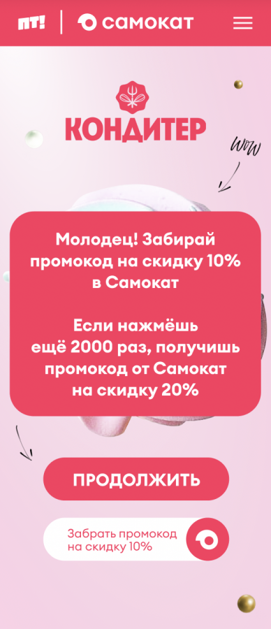 Во время эфира «Кондитера» на экране появлялась интерактивная плашка с безе и предложением расколоть десерт, чтобы выиграть призы от «Самоката». По QR-коду, который располагался на экране, зрители переходили на специальный лендинг и нажимали на интерактивный объект в виде безе. Чем больше и чаще пользователи «тапали» по безе в своем гаджете, тем быстрее десерт ломался в режиме реального времени в эфире «Пятницы!».