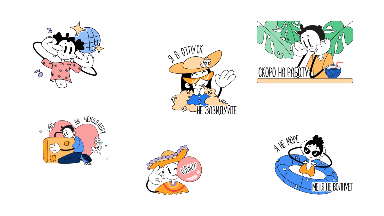 Третий стикерпак, который разрабатывали в компании, решили сделать ситуативным — на отпускную тематику. Незадолго до запуска комнада «Работа.ру» обновила визуальную стилистику соцсетей бренда — её и стали использовать. Особое внимание уделили персонажам, которые использовались в создании контента для соцсетей. Это сделало стикерпак органичным.
