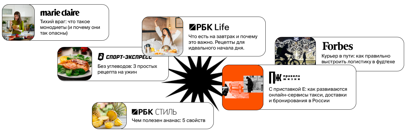 Мы активно подсвечивали бренд в СМИ: делились экспертизой в функциональном питании с «РБК Стилем» и «РБК Life», Marie Claire и «Спорт-Экспресс». Вышли в Forbes со статьёй о том, как качественно выстроить логистику в фудтехе и комментарием в «Правилах жизни» о будущем HoReCa и e-commerce. Материалы охватили более 8,8 млн человек.