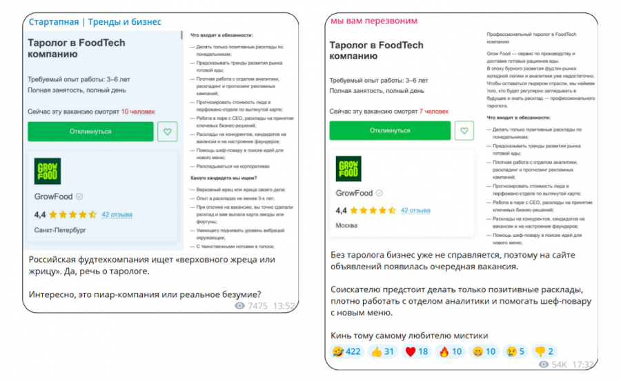 В преддверии «Чёрной пятницы» Grow Food создал собственную колоду карт таро. Её можно было выиграть в официальных аккаунтах компании в социальных сетях. Мы продумали и реализовали креативную активацию — разместили на сайте hh.ru вакансию: «Таролог в FoodTech компанию».