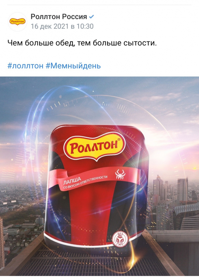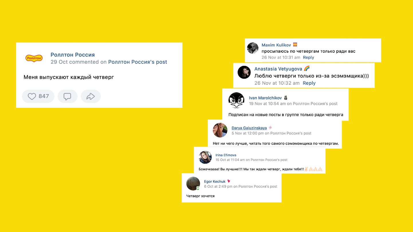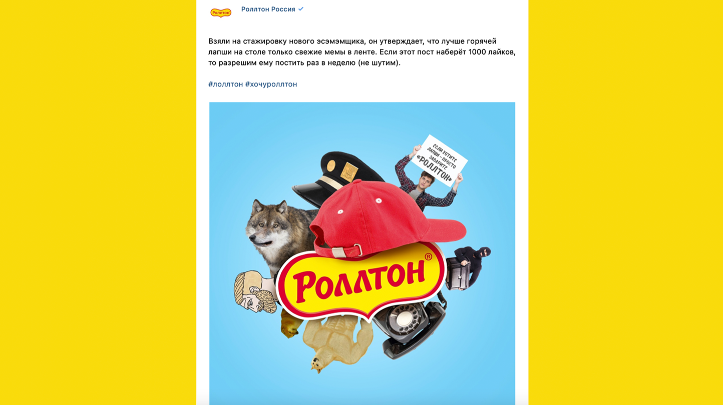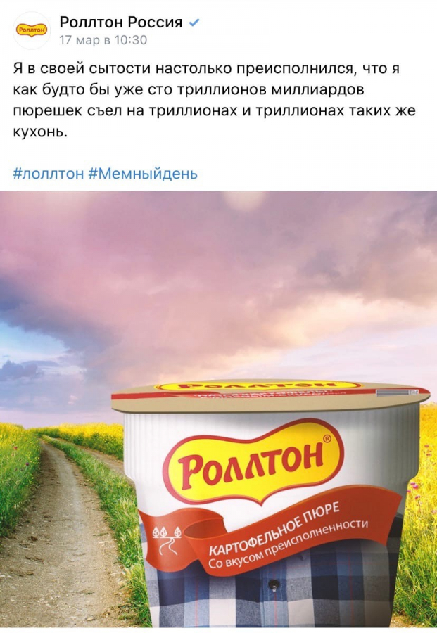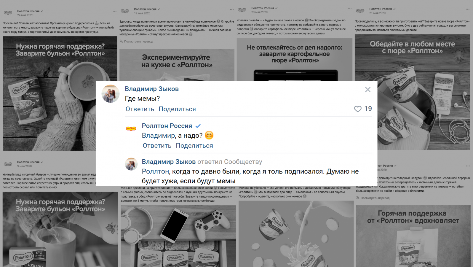 «Роллтон» всегда стремится быть на одной волне со всеми потребителями. Поэтому в рамках омниканальной коммуникационной стратегии мы не могли обойти такую охватную площадку, как «ВКонтакте». Для неё нужен свой персонализированный подход, свойственный именно этой социальной сети. Понимая специфику возраста аудитории «ВКонтакте», тематику контента, публикуемого в популярных пабликах, и что лучше «залетает», мы рискнули и зашли на сторону мемов. Тем самым мы постарались показать, что «Роллтон» общается на одном языке с молодой аудиторией, донося не только продуктовые характеристики (вкус и ассортимент), но и эмоциональные, преподнося их интересно, «мемно» и вирально.