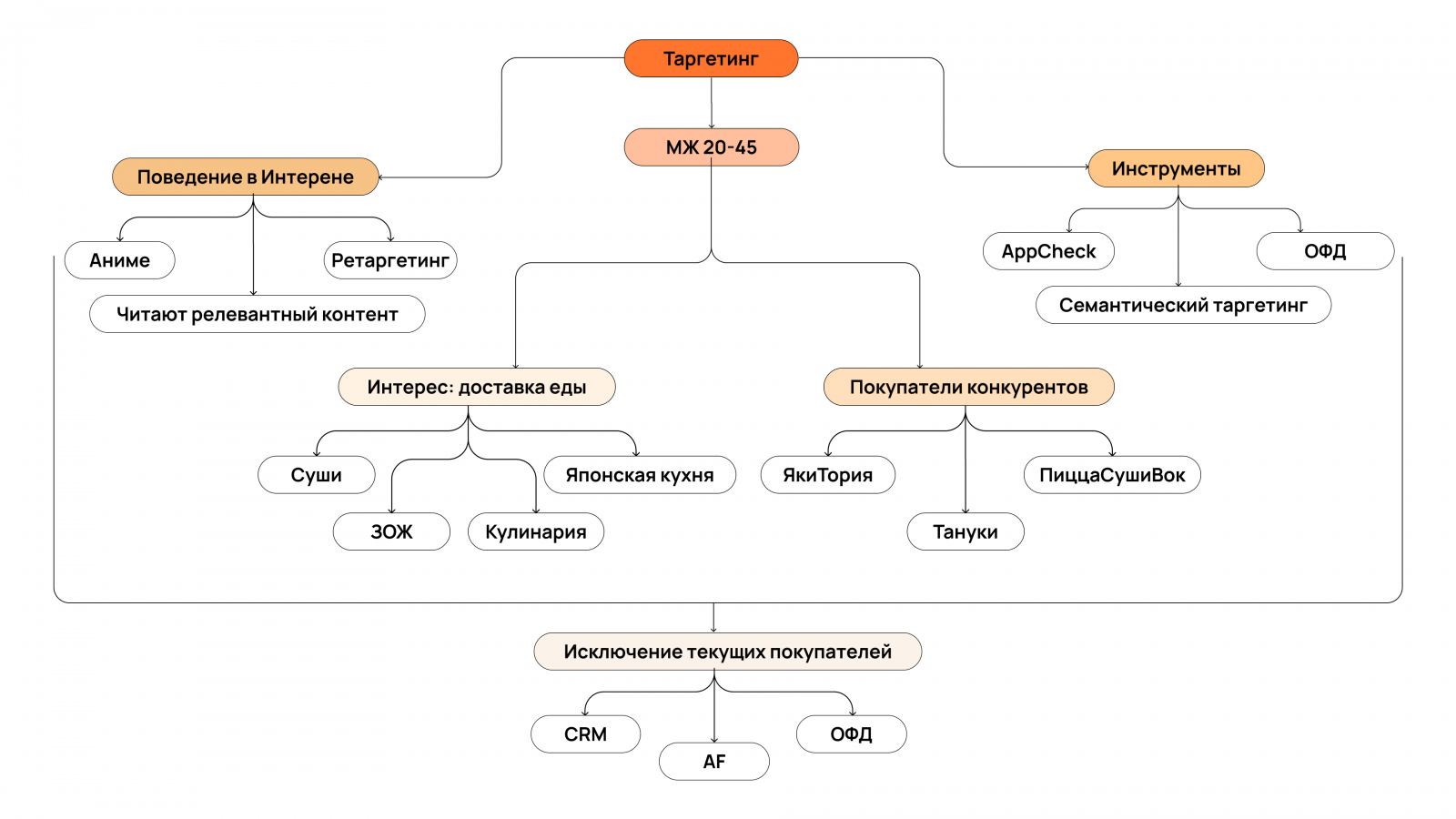 Профиль пользователя строился на сочетании интересов, поведения, геолокации и установленных приложений. Исключались пользователи, ранее уже совершавшие покупки.