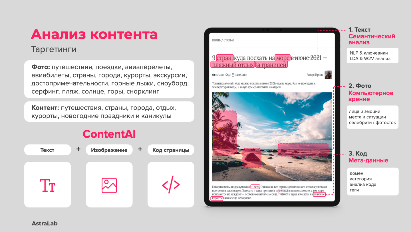 Система искала статьи про путешествия, разделяла их на категории в соответствии с тематикой креативов: море, горы, города, равнины. Например, если пользователь читал статью «Куда поехать на море летом 2021», и в ней была фотография моря, то поверх фото динамически размещался креатив с рекомендацией провести отпуск в Сочи, Симферополе или Анапе. И так по аналогии с другими креативами.