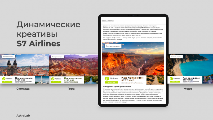 Специализация платформы AstraLab — нестандартные технологические решения. Под задачи S7 Airlines был выбран формат In-Image — реклама поверх фото на контентных сайтах, а точнее, In-Image Max — улучшенная версия классического формата.