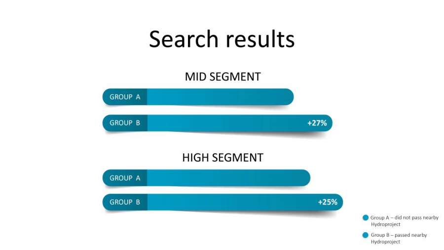 Рекламное объявление размещалось на фасаде НИИ Гидропроекта на протяжении двух месяцев. Для оценки эффективности агентство Starcom предложило провести AB-тестирование и сравнить активность двух групп, одна из которых видела рекламу Samsung на наружной конструкции, а другая нет.