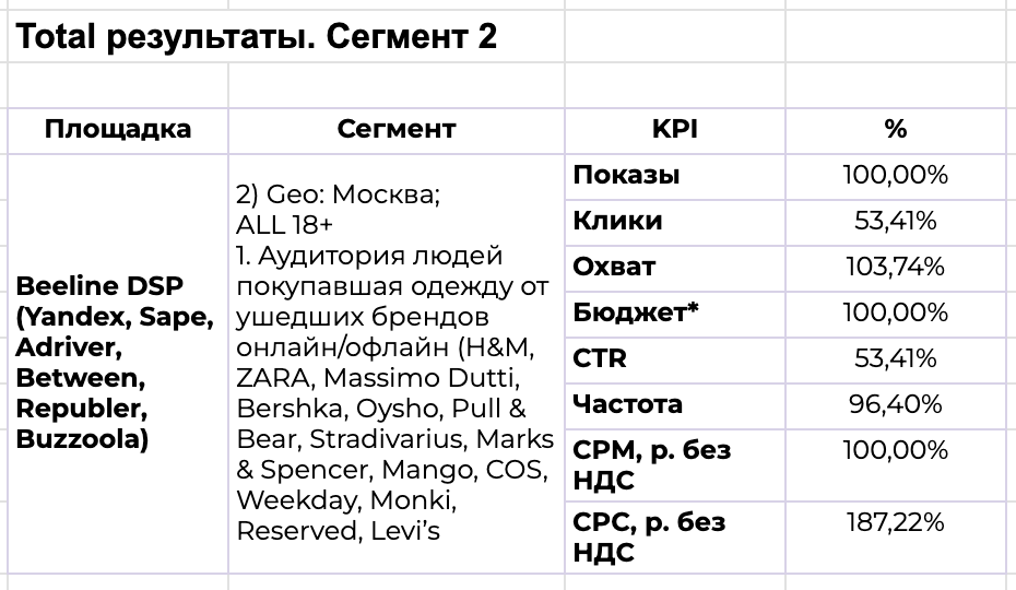 При сравнении статистики по сегментам можно увидеть, что в разрезе медийных показателей аудитория второго сегмента, покупавшая одежду ушедших брендов, отработала лучше и продемонстрировала более высокий CTR, большее количество кликов и более низкий CPC при отработке обоих сегментов в равных условиях.