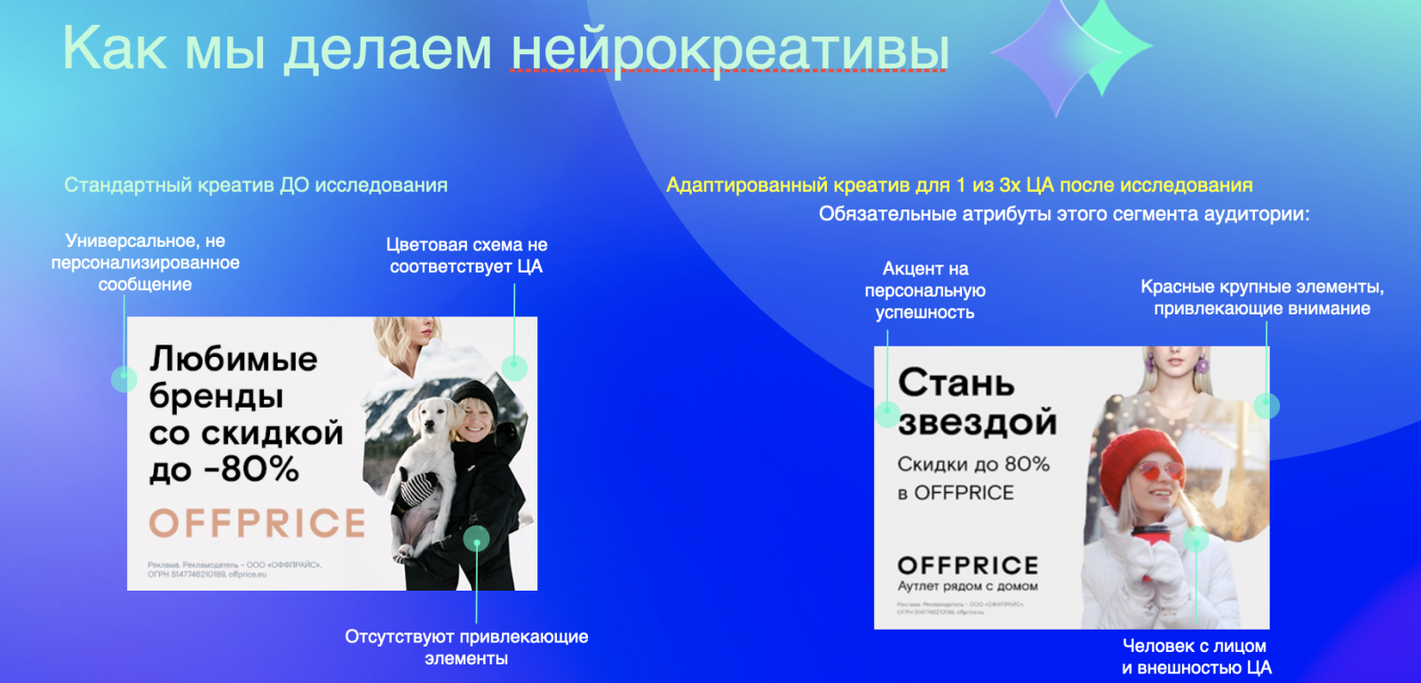 - Провели нейромаркетинговое исследование, проработали адаптированную маркетинговую коммуникацию с аудиторией через персонализированные креативы.