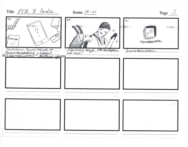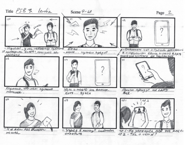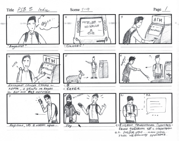 Например, вот первая раскадровка истории, где у ребят кончились деньги в поездке. По ходу пришлось отбросить сценарий с банкоматом. Нужна была другая отправная точка и мотивация, и второстепенная коза сменилась индийским торговцем.