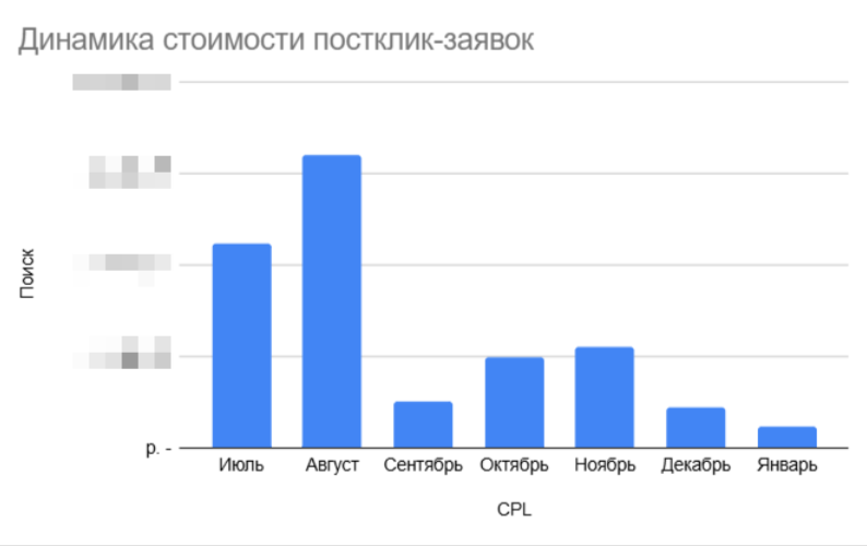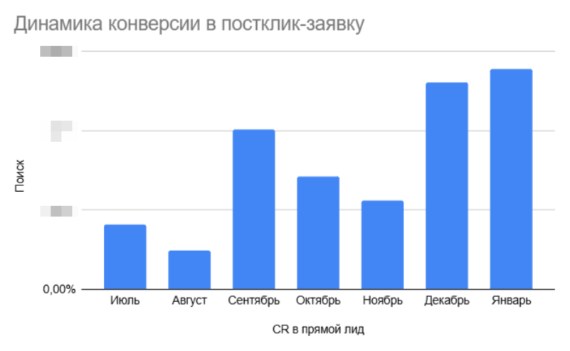 В период спада сезонного спроса фокусировались на «Поиске», так как пользователи уже находились на этапе принятия решения. Ключевыми метриками оценки эффективности стали % внешних переходов, CR в прямой лид, количество и стоимость прямых и постопен-лидов.