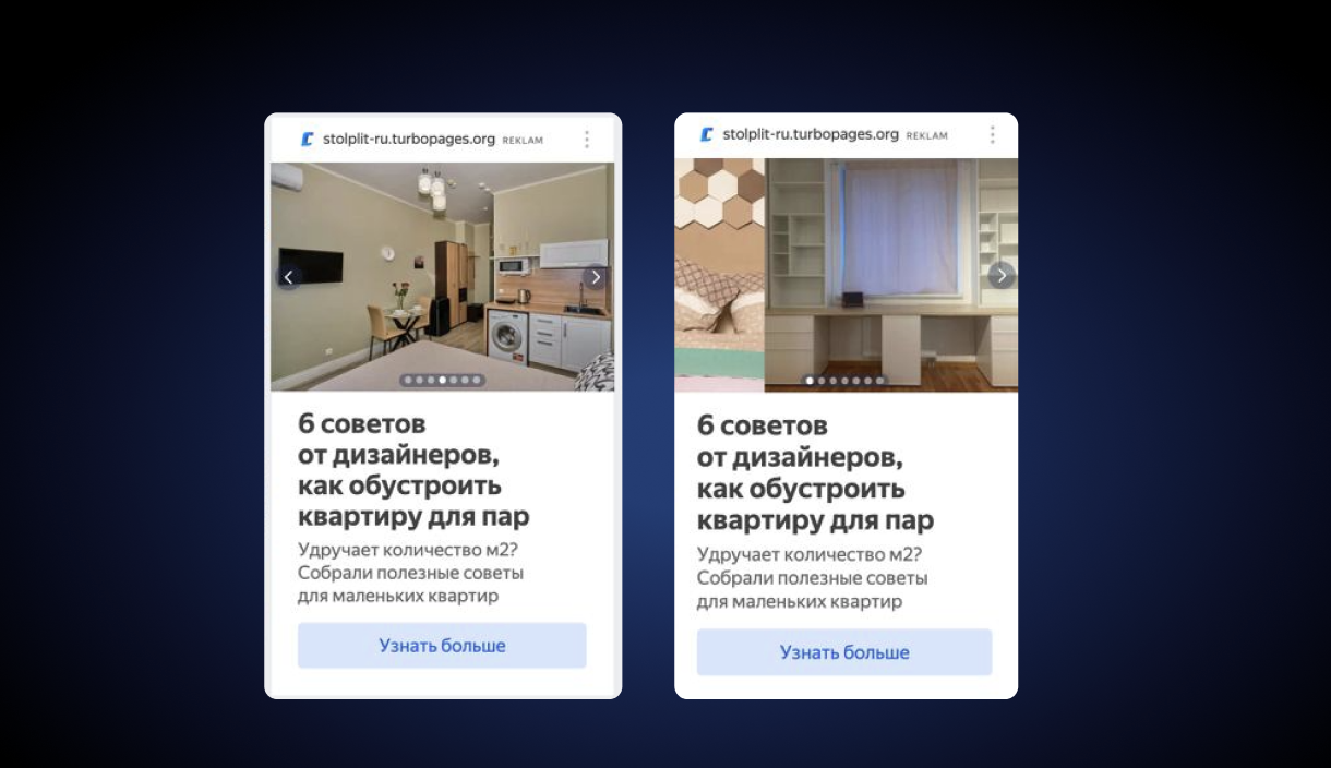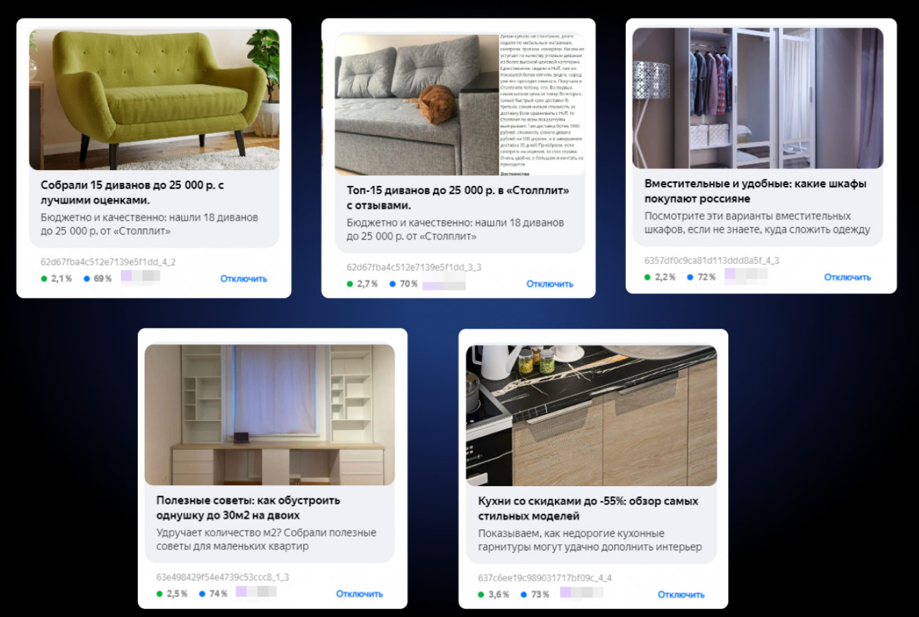 Тестируем обложки. Разные сочетания заголовков и изображений на объявлениях в РСЯ. Чаще всего это мебель в разных ракурсах, коллажи с товарами определённой категории, фото товара в интерьере. Живые отзывы с фотографиями показывают одни из лучших результатов, даже если картинка «неидеальная». А скорее именно благодаря этому.