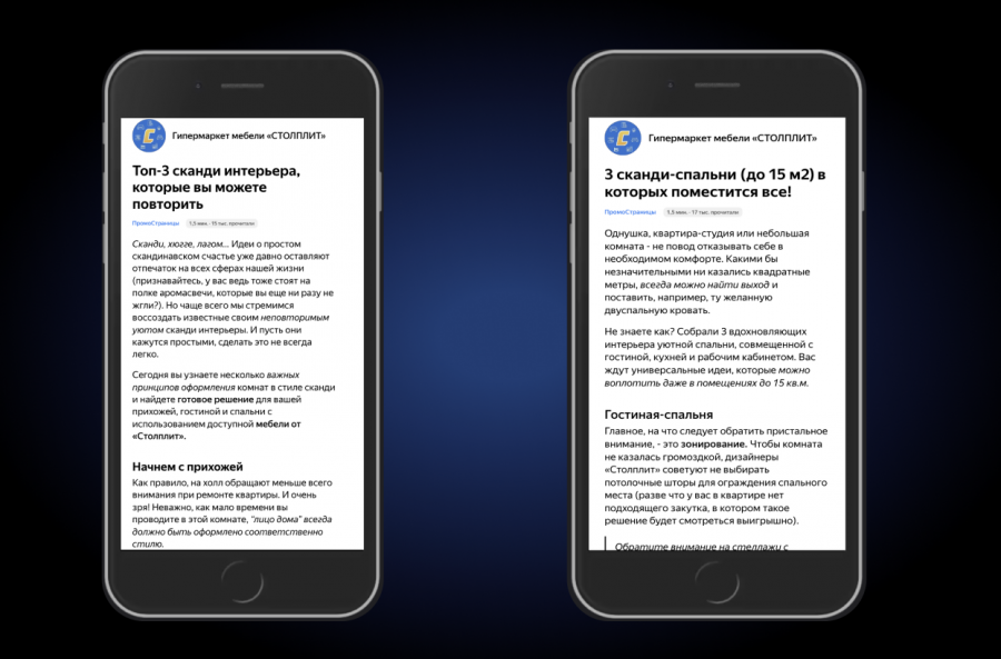 На старте мы с командой провели брифинг клиента: выделили сильные стороны и ключевые предложения, которые важно осветить в рекламных статьях. Определили самые «горячие» темы — в тот момент это была тема бюджетных аналогов ушедшего популярного магазина мебели. Далее мы подготовили несколько статей, например «Топ-3 сканди-интерьера, которые вы можете повторить» и «Три сканди-спальни до 15 м², в которых поместится всё!», и запустили кампанию.