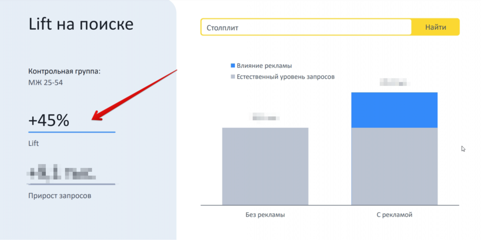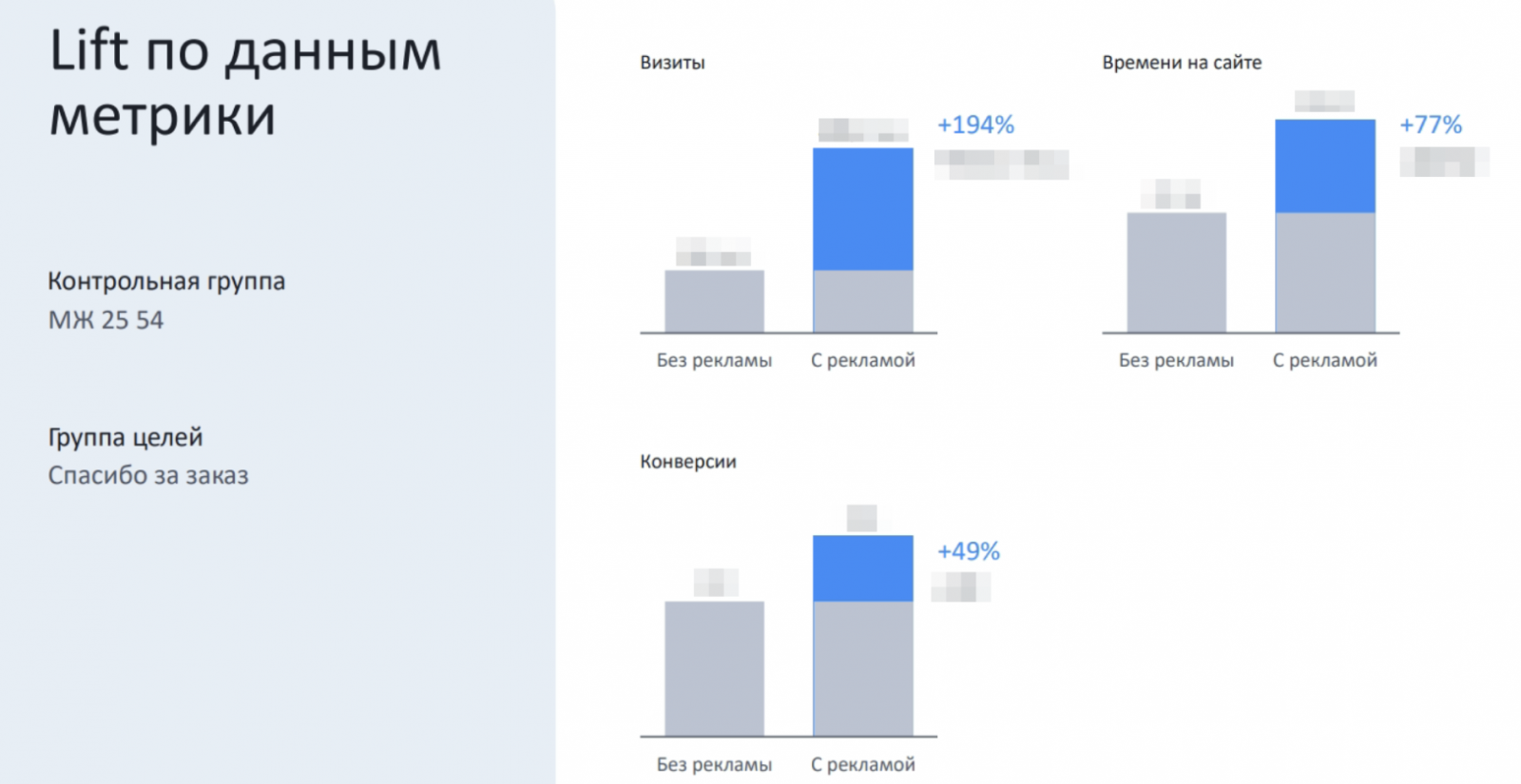 Дополнительно мы оценили влияние «ПромоСтраниц» благодаря post-campaign аналитике инструмента, где оценивалось влияние рекламы на поведение контрольной группы. В рамках осеннего запуска за три месяца работы рост запросов на поиске составил 45%, рост визитов вырос на 194%, рост времени на сайте — на 77%, рост конверсий — на 49%.