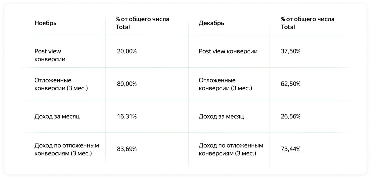 Сводим статистику за длительные периоды. Это 3−5 месяцев работы. Нужно, чтобы актуализировать результаты и учесть «докаты» по post-view в «Яндекс Метрике».