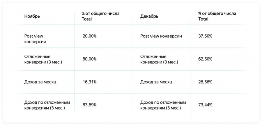 Похожую картину видим за другие месяцы. Например, соотношение числа конверсий за декабрь, где первая цифра — результат по итогам месяца, а вторая — по истечении 2−3 месяцев, составило 37,50 к 62,50%. Дохода — 26,56 к 73,44%.