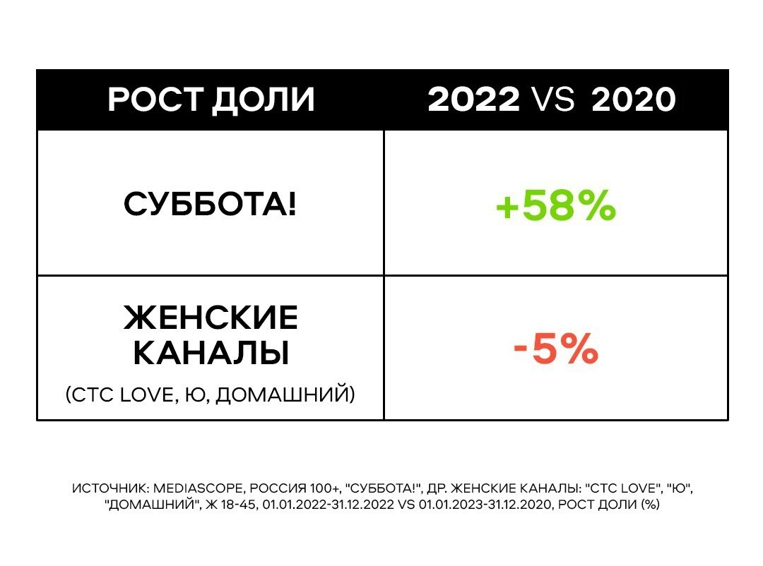 Всего за два года «Суббота!» стала главной альфа-самкой рынка. Нам удалось показать рост доли на фоне падения аудитории каналов-конкурентов. В России существует большая развлекательная тройка каналов, куда входит «Пятница!», СТС и ТНТ. А «Суббота!» входит в, назовём это так, знаменитый женский треугольник наряду с телеканалом «Ю» и СТС Love. И внутри этого треугольника во втором полугодии 2022 мы стали лидерами по доле с учётом малых городов.