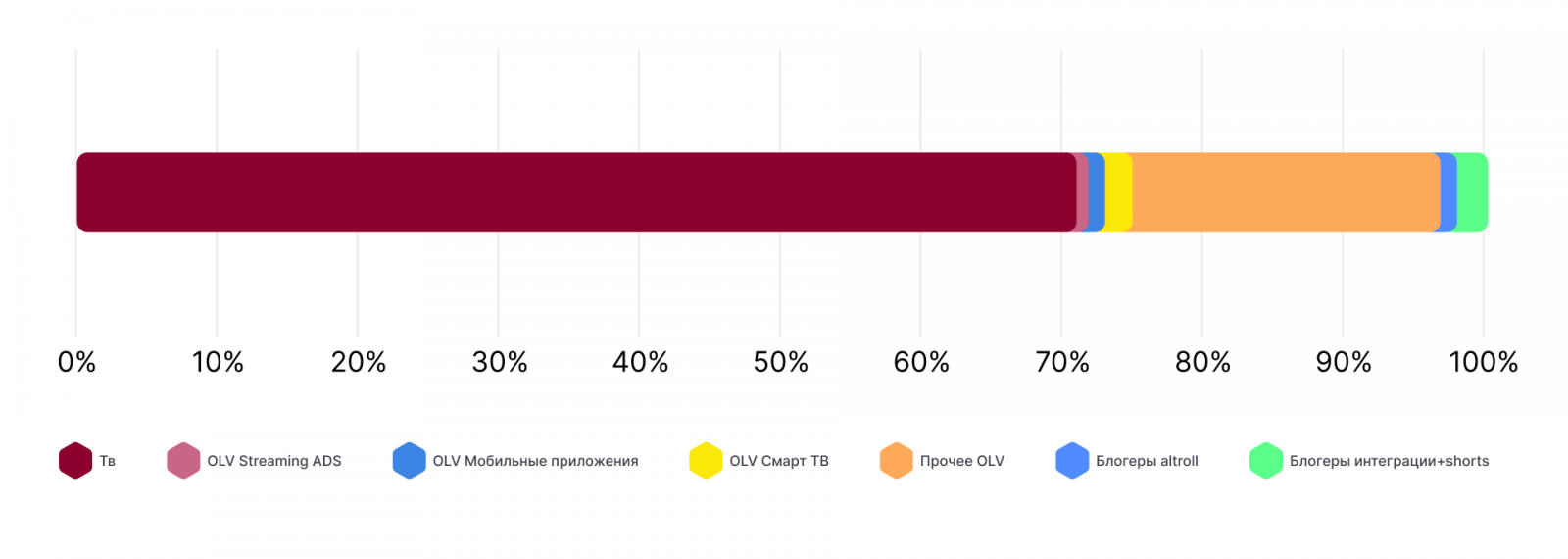 - OLV в разбивке на форматы (Смарт ТВ, ТВ-стриминг, реклама в In App и др).