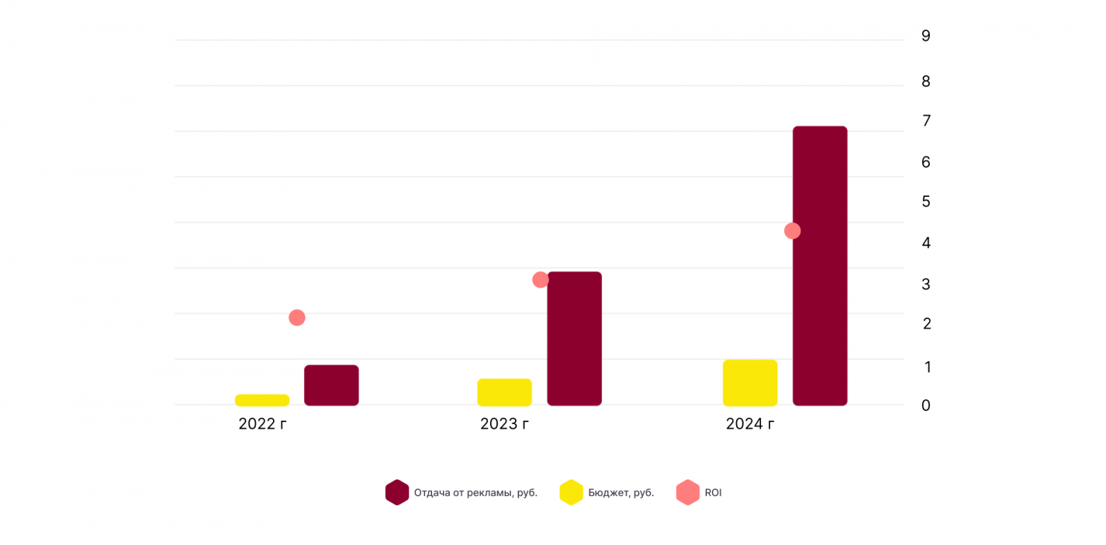 - в 2,5 раза выросла отдача от рекламы в виде ROI;