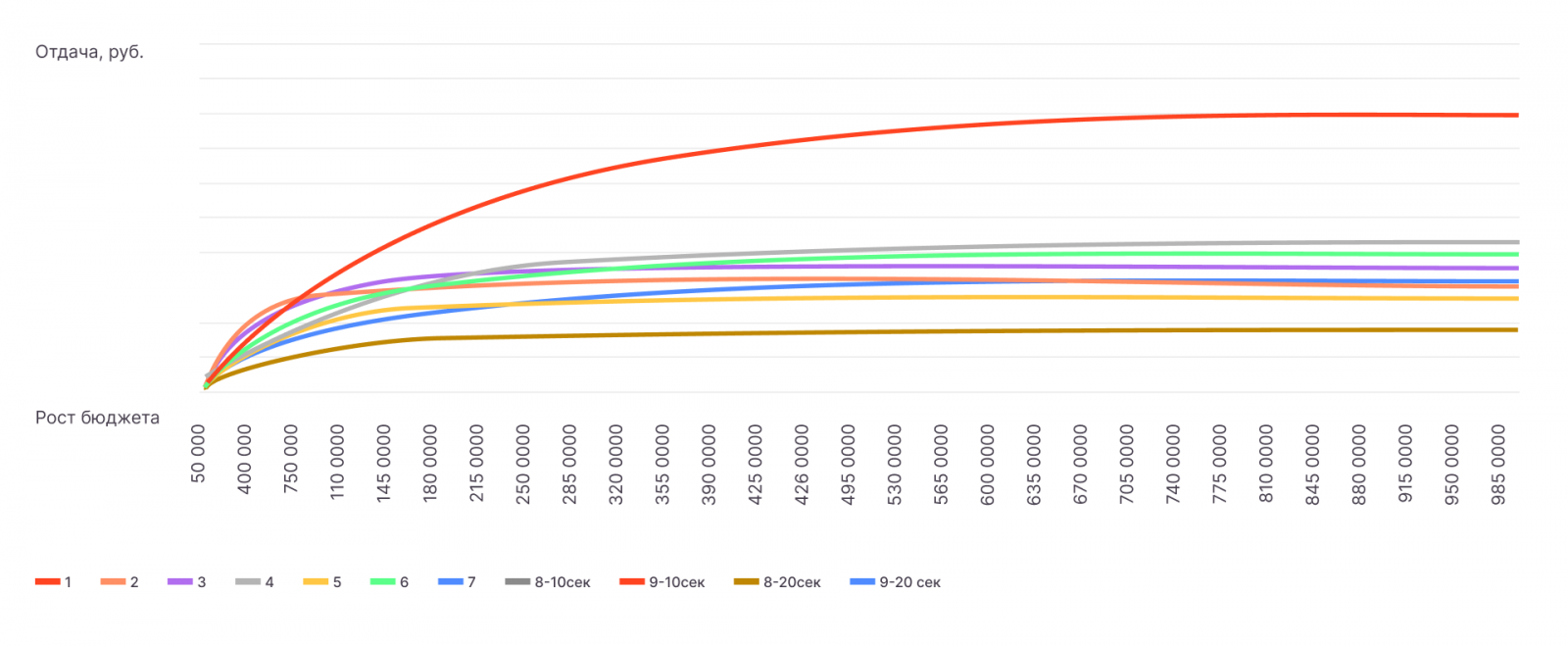Каждый креатив по-разному накапливает свою отдачу. Это помогает понять предельный бюджет флайта в зависимости от типа креатива и хронометража ролика.