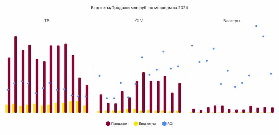 При анализе диджитал-размещения, эффективность ОЛВ-рекламы и блогеров заметно выше по ROI, несмотря на меньший бюджет по сравнению с ТВ.