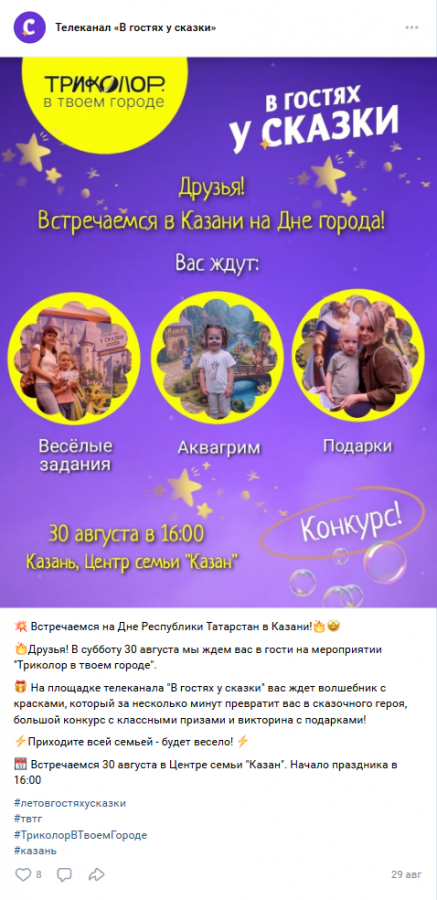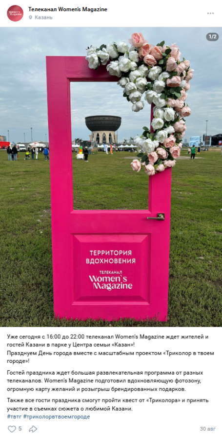 Оператор интегрировался в городские праздничные события и привлек к организации офлайн-активностей 25 телеканалов. Гостям было предложено не только пройти квест, но и поучаствовать в конкурсах и мастер-классах, перевоплотиться в героев сериалов и мультфильмов, и выиграть призы и технику под брендом «Триколор».