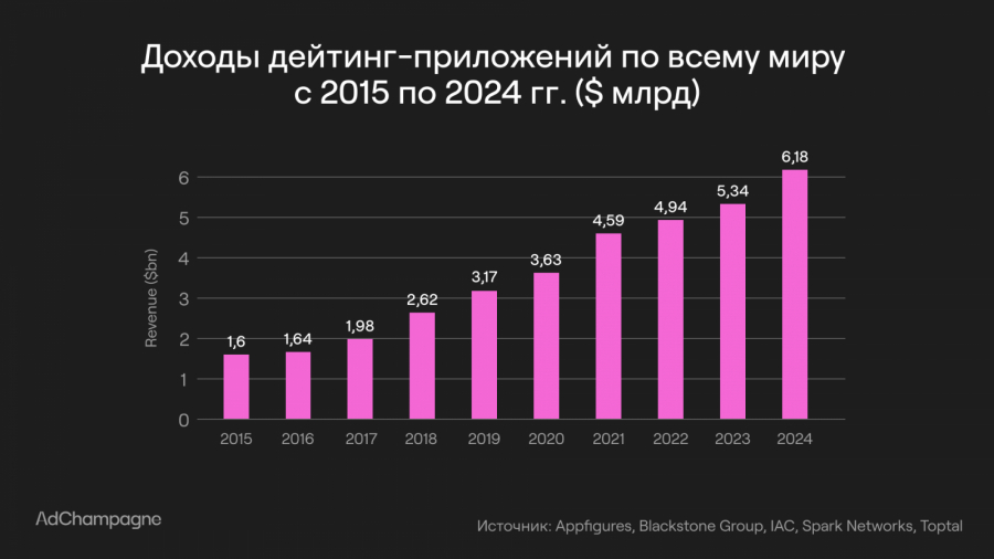 Эти задачи формировались в контексте динамики рынка: только в 2024 году мировая выручка дейтинг-приложений достигла $6,18 млрд, при более чем 350 млн пользователей, из которых 25 млн регулярно пользуются платными сервисами.