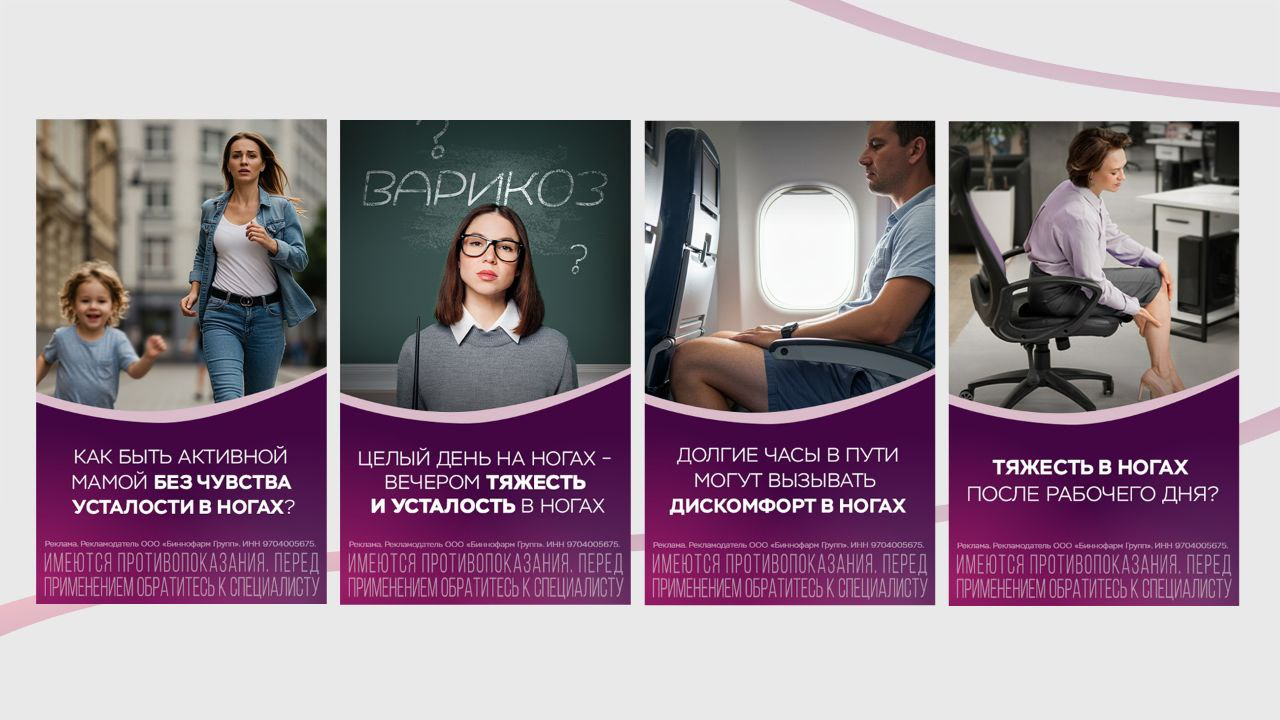 Для предотвращения прогрессирования ХЗВ (хронических заболеваний вен) важно своевременное начало терапии. Данная рекламная кампания стала действенным инструментом в решении и этой задачи на потребителей, которые не осознают проблему и не являются пользователями категории венотоников.