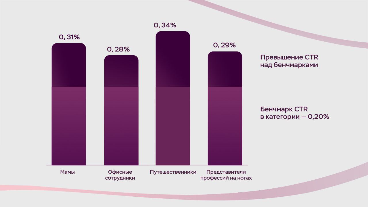 Заинтересованность оценивается с помощью кликабельности рекламных баннеров (CTR). Это первичный и важный показатель того, что сообщение достигло целевой аудитории. По итогам размещения кликабельность значительно превышает бенчмарки в категории.