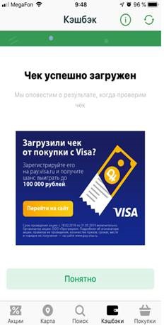 Баннер в разделе «Кэшбэки» предлагал пользователям перейти на промосайт акции, загрузить чек покупки сделанной с Visa и получить гарантированный денежный приз или шансы выиграть 100 тысяч рублей.