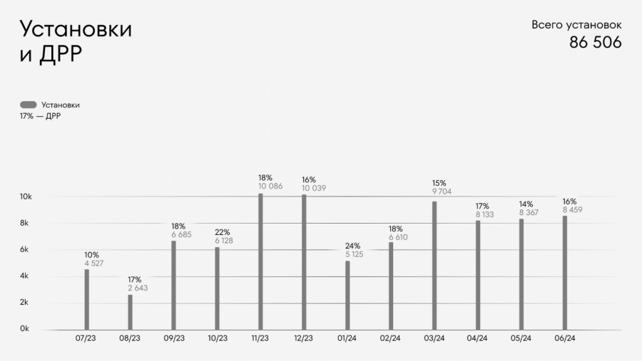 В течение 12 месяцев мы равномерно привлекали пользователей, тестируя товары и креативы, чтобы выявить и масштабировать лучшие с точки зрения окупаемости подходы. Рекордным стал результат в 14% ДРР в мае 2024.