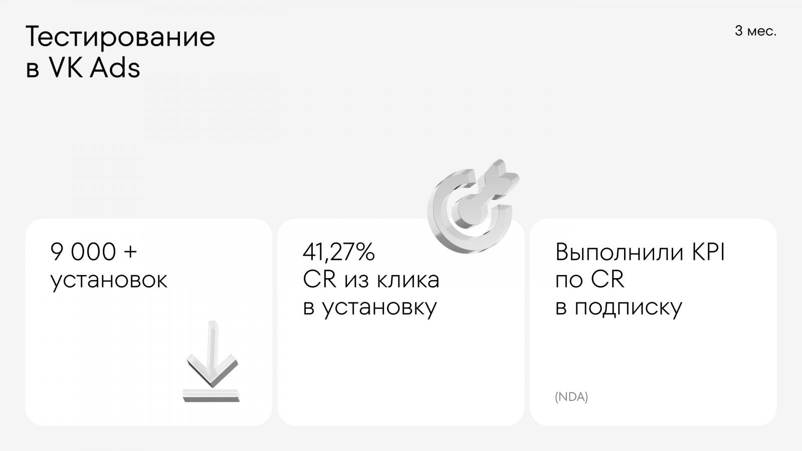 - Определить эффективные креативы с помощью тестов в VK Ads и масштабировать их на другие источники;