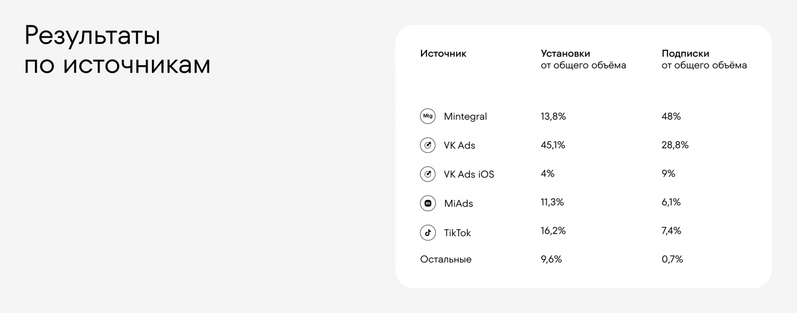 Источники: VK Ads, Mintegral, TikTok Ads, MiAds, Bigo, Unity.