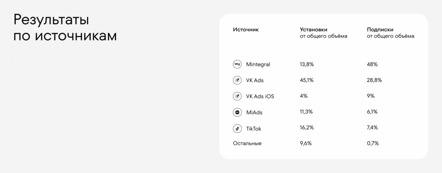 Лучший результат по конверсии дал in-app источник Mintegral за счет сложной ручной оптимизации кампании и нулевого фрода. При масштабировании источник принес сервису 48% платных подписчиков от всего объема рекламных конверсий.