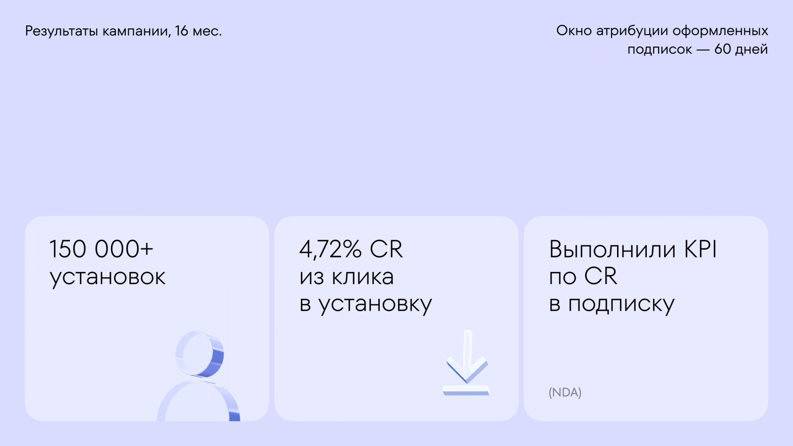 Whiteleads предложило работать по модели CPI — с оплатой за установку — и гарантировало конверсию, близкую к органике. Так можно было масштабировать кампанию, тестировать больше гипотез в креативах и сохранять качество трафика.
