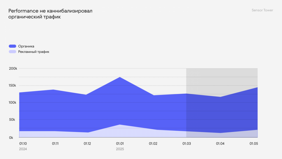 Отдельный тест на инкрементальность не проводился, но данные Sensor Tower показали: при росте рекламного трафика органические установки не снижались.