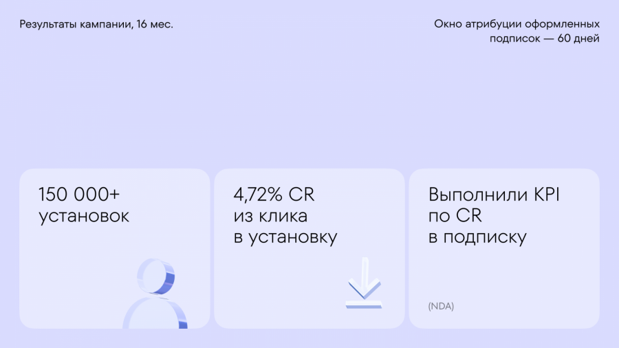 Цель кампании: не только число установок, но и количество платных подписчиков. Поэтому кампанию запустили по модели CPA — в Twinby хотели, чтобы каждая десятая установка конвертировалась в платную подписку.