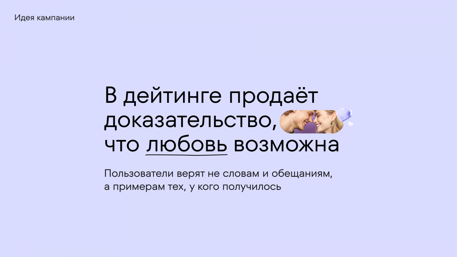 Нативная история знакомства — от первого сообщения до личной встречи. Инсайт креатива: пользователям важно понимать, что приложением пользуются живые люди, с которыми можно пойти на свидание и построить настоящие отношения. Весь сценарий построен на переписке и реальной встрече людей.