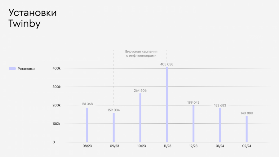 Twinby запустили в июне 2023 года. До старта работы с Whiteleads команда уже привлекла в приложение 2,72 млн пользователей. Большой рост установок дала вирусная кампания с инфлюенсерами Ксенией Собчак и Моргенштерном (признан иноагентом): приложение установили 244 тыс. новых пользователей, а в пиковый месяц MAU составил 825 тыс. Такая реклама дала резкий прирост узнаваемости и установок, но важно было улучшить результат с помощью performance и сохранить его на постоянной основе.