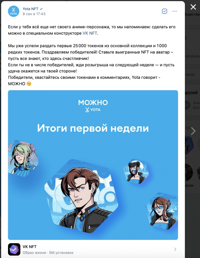Проект стал первой масштабной интеграцией Yota в сервис VK NFT. Как отмечает агентство, результаты доказывают высокий интерес к спецпроектам с NFT: