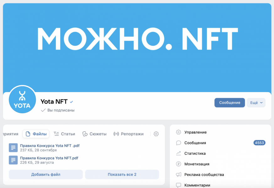 Команда продвигала проект во «ВКонтакте» с помощью промокампании с таргетингом на широкую аудиторию. Для этого она запускала рекламу промопоста во «ВКонтакте», создала виджет в разделе «Сервисы» во «ВКонтакте», а также публиковала истории в сообществе Yota NFT.