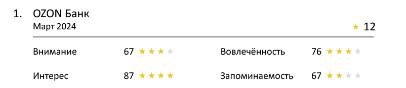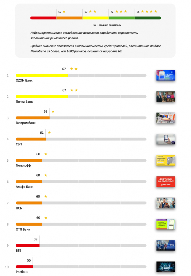 Первое место занял ролик OZON Банка — 67 баллов, за ним следует реклама Почта Банка — 64 балла, у обоих лидеров 3 звезды.