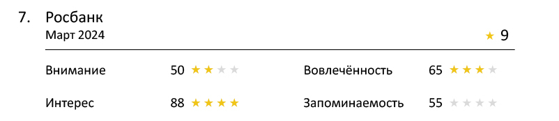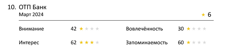 На последнем месте оказался ролик ОТП Банка, который значительно отстал от других участников, набрав всего 30 баллов и 1 звезду.