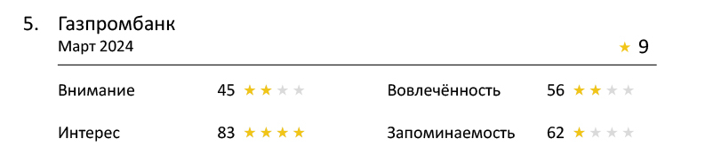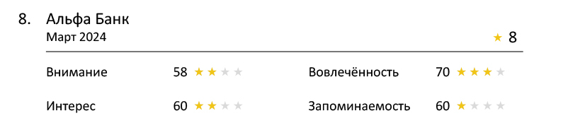 7 рекламных роликов, включая Альфа Банк, Тинькофф, ВТБ, Росбанк, СБП, ПСБ и Газпромбанк набрали от 45 до 58 баллов, получив 2 звезды.