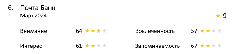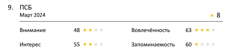 Видеоролики Почта Банка, Альфа Банка и ПСБ получили 2 звезды, что также является достойным показателем.