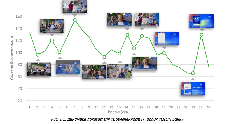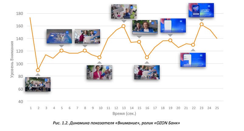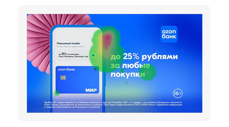 В этот момент на экране нет ничего кроме карты OZON Банка, а на карте нет ничего кроме надписи, тем не менее происходит рост и эмоциональной вовлечённости, и изменения эмоциональной реакции. Значит реакция точно была ответом на звуковое сообщение — как раз про 25% кешбэк.