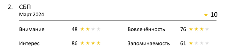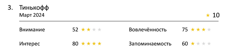 Большинство роликов получили 3 звезды, это значения от 63 до 76 баллов. В своей рекламе OZON Банк, СБП, Альфа Банк, Росбанк и ПСБ использовали известных личностей в разных сюжетах и образах. Тинькофф и ВТБ показали ценности своих предложений через бытовые и семейные сцены.