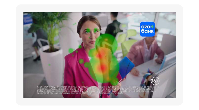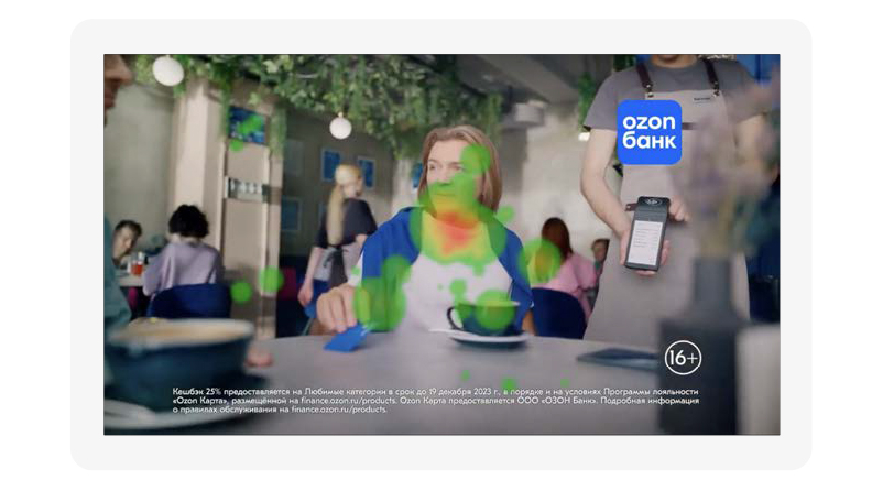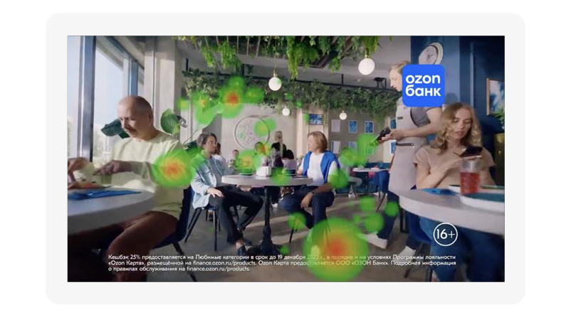 В начале ролика наблюдается некоторое снижение внимания. Это обусловлено достаточно пестрой обстановкой: несколько человек в кадре, движение героев и официанта. На тепловой карте виден целый ряд зон интересов респондентов.